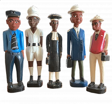 Gruppo di cinque sculture africane in legno dipinto a mano, anni '50. Raffigurano diversi lavoratori: il funzionario, il gendarme, l'avvocato, l'operaio e l'impiegato.