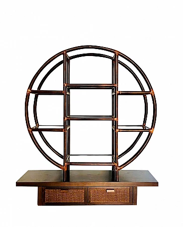 Libreria in bamboo circolare con ripiani in vetro, parte inferiore completa di 2 cassetti. Utilizzabili anche separatamente. Design anni '80. In buone condizioni, con lievi segni di usura visibili in foto. Misure altezza tot. 170 cm altezza libreria 146 cm altezza mobile 25 cm larghezza tot. 150 cm larghezza libreria 140 cm profondità 43 cm