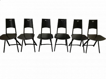 Set di sei sedie pieghevoli Mia nere di Giorgio Cattelan, anni '80. Schienale e gambe in acciaio, seduta in MDF. Presentano alcuni graffi e difetti della vernice dovuti all'età e all'uso.
