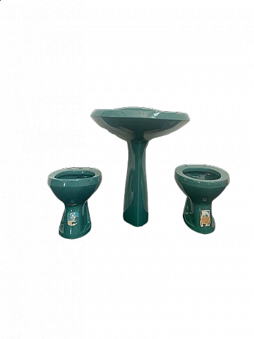 Dopo il successo ottenuto con la serie Z e la serie Oneline di Gio Ponti, lo studio tecnico Ideal Standard ha prodotto la linea Elisse. Una nuova concezione più ridotta, funzionale e di grande qualità. Questo modello in ceramica vetrochina ebbe successo primeggiando negli anni '80 e subendo evoluzioni, trasformazione e adattamenti fino al 2000. Dimensioni lavabo: cm h. 80 x 69 x p. 56; bidet: cm h. 39 x 35 x 57; wc: cm h. 37 x 35 x p. 46. Colore verde scogliera. Ottime condizioni. Rivista Domus.