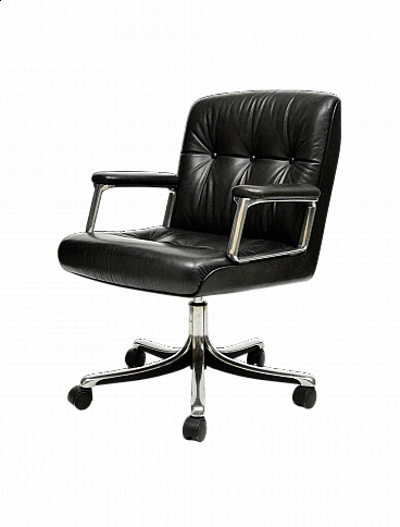 La poltrona P126 è stata disegnata negli anni '60 da Osvaldo Borsani per Tecno, questa versione è in pelle, è girevole, ha le ruote ma non è regolabile in altezza. La poltrona è stata completamente smontata, le parti in alluminio lucidate e la pelle pulita e nutrita. La poltrona ha un graffio sul bracciolo destro (superficiale) e ha un paio di leggeri segni sullo schienale come si può evincere dalle foto. Queste imperfezioni sono segnalate esclusivamente per scrupolo perché la poltrona è in condizioni eccellenti.