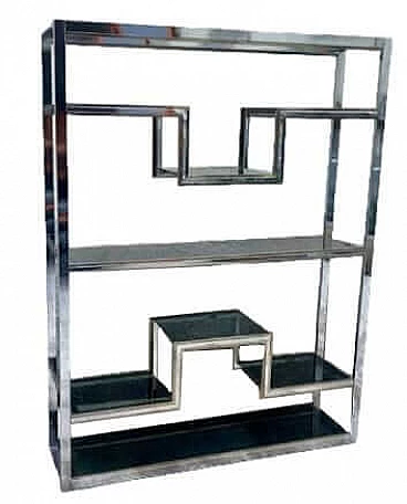 Libreria in metallo cromato e ottone con ripiani in vetro fumé di Romeo Rega, anni '70. Il vetro è originale; le parti metalliche hanno alcuni segni di ossidazione e due graffi.