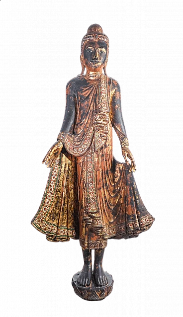 Statua di Buddha in legno scolpito e dorato, con vetrini innestati. Thailandia, XIX secolo. H 105 x L 47 x 16 cm. La scultura è in condizioni molto buone, come è possibile constatare dalle foto allegate. Riporta normali tracce del tempo, in particolare la mancanza di alcuni vetrini. Valutare attraverso le foto.