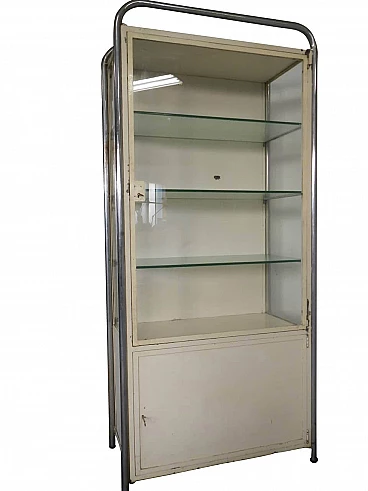 Vetrina in metallo e vetri con parti cromate con chiavi sulle due porte funzionanti. Con piani in vetro originali. Anni '50