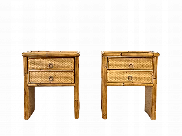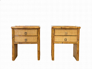 Coppia di comodini di Studio Smania, anni '70. Struttura in vimini e bambù, coppia di cassetti con maniglie in ottone.