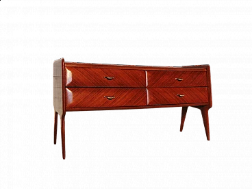 Cassettiera in ciliegio con piano in vetro, anni '50. Dotata di quattro cassetti con maniglie in ottone.