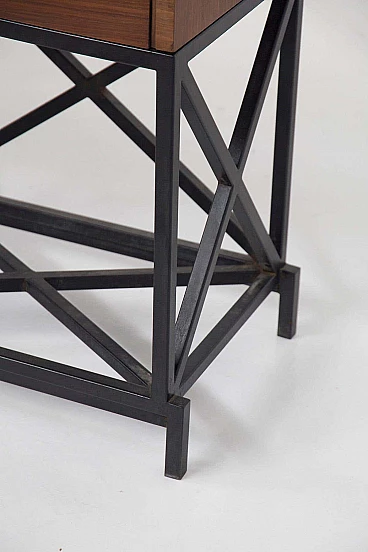 Splendida e rarissima credenza disegnata dai grandi designer Banfi, Belgioiso, Peressutti nel 1941. Pubblicato un esemplare molto simile. La credenza è di una bellezza disumana, con una base che rappresenta il suo punto di forza. La base è in metallo verniciato nero, molto elegante e adatta allo stile industriale che questa credenza segue. La base copre l'intera profondità del pezzo ed è realizzata all'interno di una cornice rettangolare dalla forma piuttosto rigida e dura. All'interno di questa cornice vediamo tre grandi blocchi a forma di cubo all'interno dei quali sono state collocate le tavole di metallo, alcune in diagonale, altre dritte, altre ancora più alte. Creano un effetto semplicemente incantevole e accattivante. Questo gioco geometrico è il punto focale di questa splendida credenza. La struttura è sostenuta da quattro rigidi e geometrici piedi quadrati. In alto vediamo il corpo centrale della credenza, interamente realizzato in legno massello scuro e pregiato; vi sono tre cassetti che corrono per tutta la lunghezza della credenza, ciascuno con due intarsi sferici in ottone che ne consentono l'apertura. Sopra di essi si trova un piano più piccolo, evidenziato da una struttura che lo solleva, lunga quanto l'intera credenza, realizzata in un bellissimo cristallo molato che le conferisce una bellezza fuori dal comune. La credenza è adatta ad ambienti industrial chic, moderni e vintage. È un prodotto che può essere molto adattabile al tipo di ambiente già presente. Un esempio simile di questa credenza è pubblicato tra i libri di design vintage.