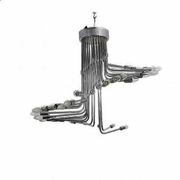 Lampadario in metallo cromato con forma a spirale per poter distribuire in modo uniforme i 30 punti luce. Presenta leggera ossidazione.