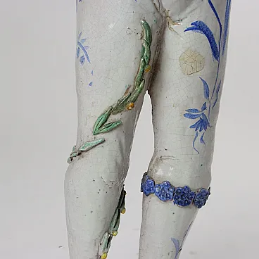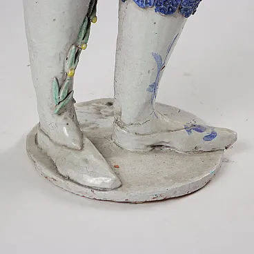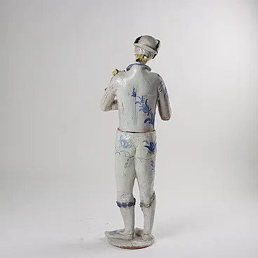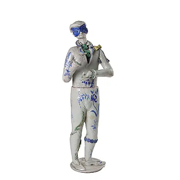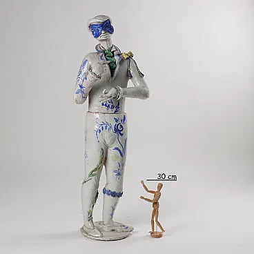 Grande statua in terracotta smaltata a policromia raffigurante figura in maschera. La scultura è composta da due parti: il busto e le gambe.