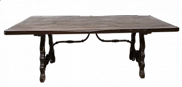 Tavolo fratino in legno massello con gambe a lira e supporti metallici