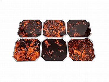 Set di sei sottopiatti nello stile di Gabriella Crespi, anni '70. In plexiglass effetto tartaruga con bordo in metallo cromato. Presentano leggeri graffi dovuti all'età e all'uso.
