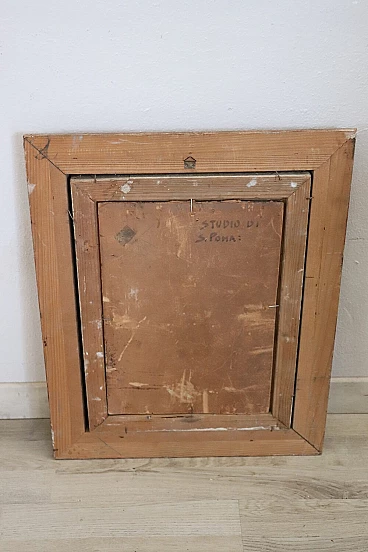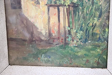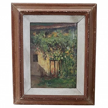 Dipinto a olio su cartone raffigurante uno scorcio di giardino e casolare realizzato da Silvio Poma alla fine dell'800. Venduto con cornice in legno che presenta alcuni difetti. Poma (1840-1932) è considerato uno dei maggiori paesaggisti del Verismo lombardo di fine '800. Nella prima parte della sua vita si dedica alla carriera militare partecipando attivamente alla Seconda Guerra d'Indipendenza e diventando poi sottotenente nella campagna contro il brigantaggio postunitario. A causa della malaria è costretto a lasciare temporaneamente il mondo militare e alle Isole Tremiti iniziano la sua formazione artistica e prima produzione caratterizzate da paesaggi. Si arruola nuovamente per la Terza Guerra d'Indipendenza ma decide di abbandonare definitivamente l'esercito nel 1869; da qui inizia effettivamente la fase artistica della sua vita.
