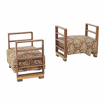 Coppia di pouf in legno e tessuto floreale Art Déco di Paolo Buffa per Serafino Arrighi, anni '30