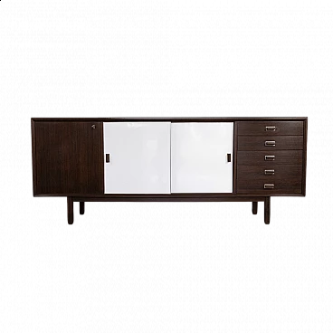 Credenza degli anni 60 in legno di palissandro completamente restaurata con 1 anta apribile, 2 ante scorrevoli rivestite in formica bianca e cassettiera. Maniglie in legno con dettagli in alluminio.