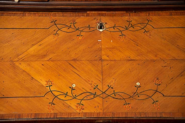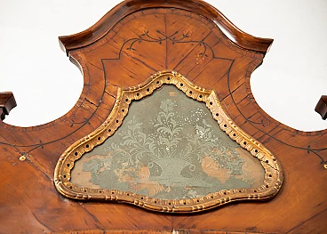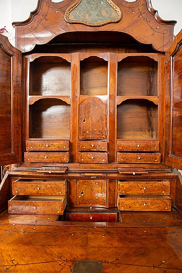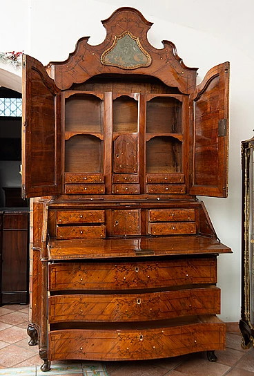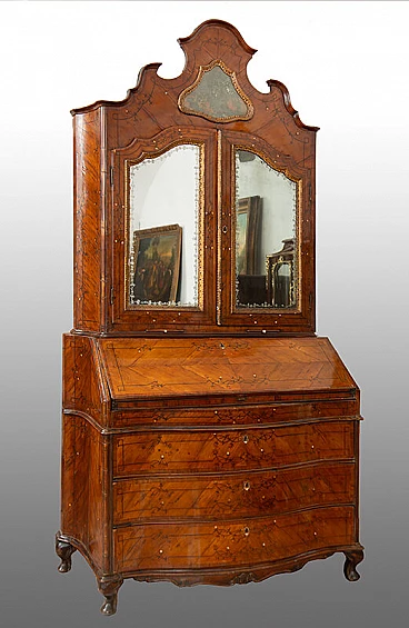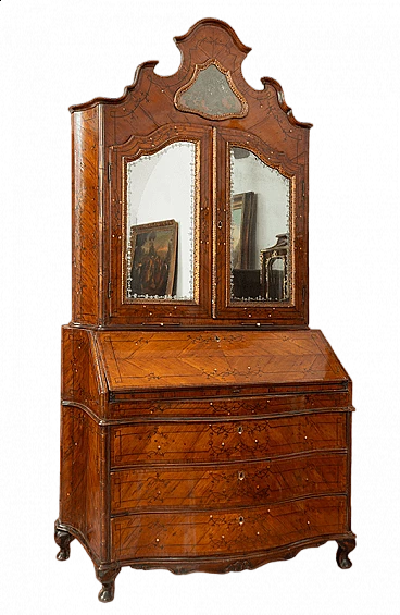 Trumeau veneziano Luigi XV in noce, con intarsi a filettature geometriche, intrecci floreali in legno ebanizzato ed inserti in legno esotico pregiato. La parte superiore presenta una cimasa mistilinea intervallata da un grosso medaglione centrale in vetro di murano. Due grosse ante, impreziosite da cornici in legno dorato, presentano all'interno una scarabattola interamente intarsiati a racemi e fiori. La parte sottostante è costituita da un'anta a ribalta con all'interno tutta una serie di cassetti e scomparti interamente intarsiati. Tre grandi cassetti bombati vanno a caratterizare il prospetto frontale e terminano con una base mistilinea ratta da piedi a cabriolet. Risalente al XVIII secolo, in ottimo stato. Misure: 137 x 60 cm, H 255 cm. Certificato di autenticità. Siamo a vostra disposizione per ulteriori chiarimenti o particolari fotografici. Spedizione inn tutta Italia, Europa e resto del mondo in massima sicurezza e tracciabilità.