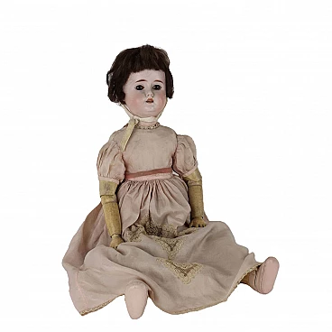 Bambola con testa in porcellana, arti in legno e occhi in vetro, inizio '900