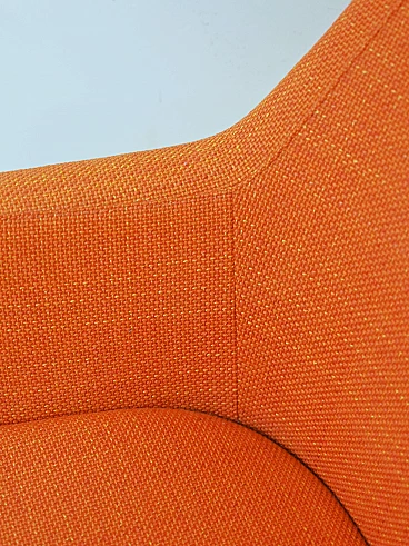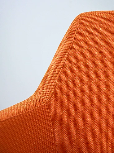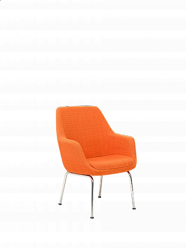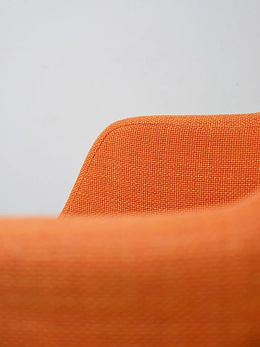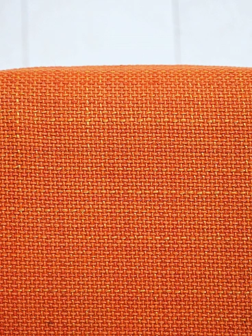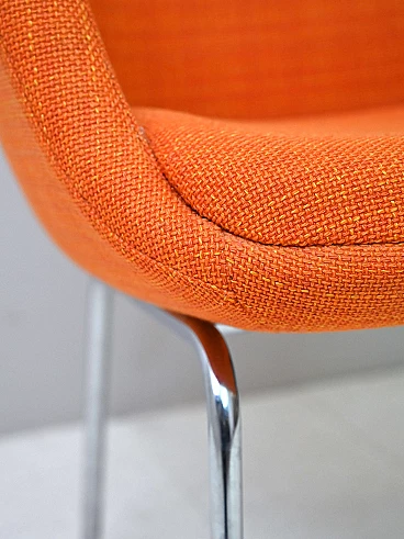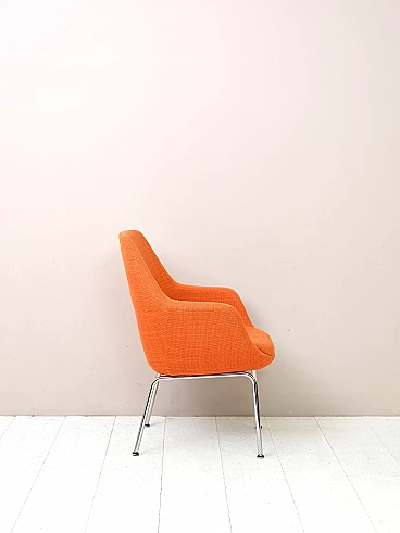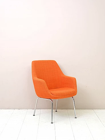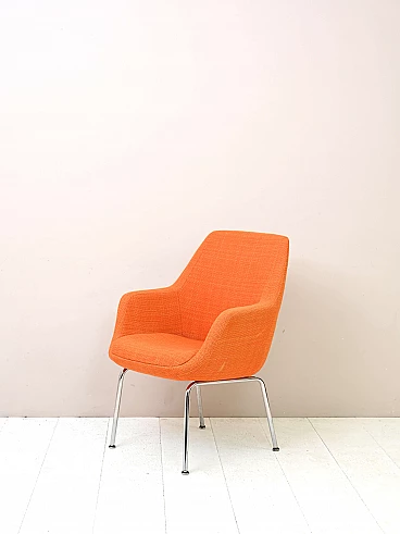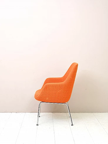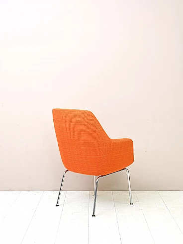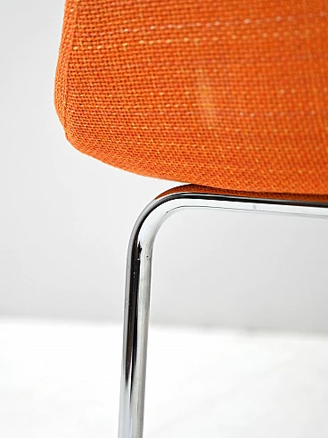 Poltrona degli anni '70 con gambe in acciaio, seduta imbottita e rivestita di tessuto arancione; quest'ultimo è originale.