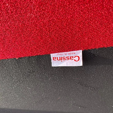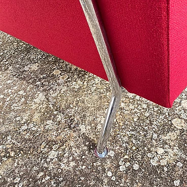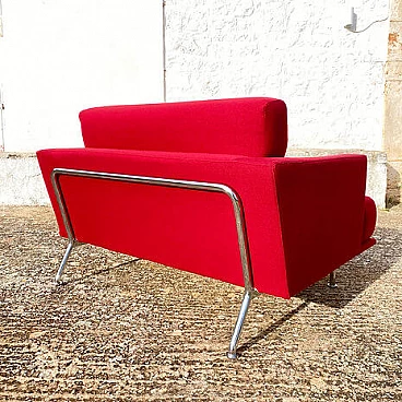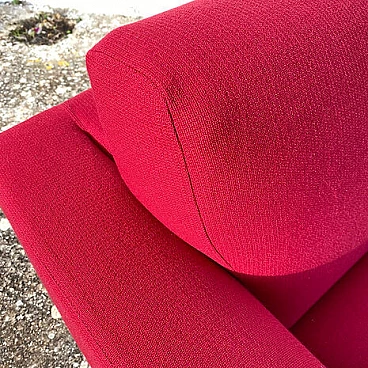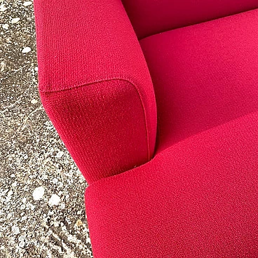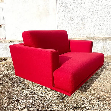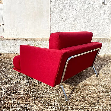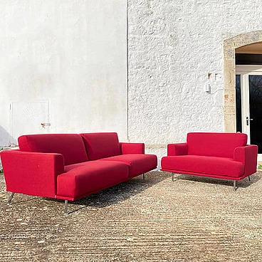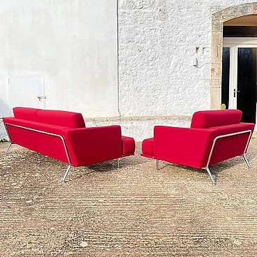 Divano a due posti e poltrona Nest di Piero Lissoni per Cassina, anni '90. Struttura interna in legno multistrato, imbottitura in poliuretano espanso privo di CFC e ovatta di poliestere, struttura portante a vista in acciaio cromato, rivestimento in tessuto rosso totalmente sfoderabile. I cuscini che costituiscono la seduta e lo schienale sono removibili. Sono presenti alcune piccole macchie. Il divano è alto 78 cm, largo 220 cm e profondo 96 cm; la seduta è alta 42 cm. La poltrona è alta 60 cm, larga 120 cm e profonda 80 cm; la seduta è alta 42 cm.