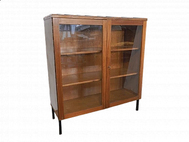 Vetrina da laboratorio, anni '60-'70. Struttura in teak, piano in formica, schiena in legno compresso, piedi in metallo. Dotata di coppia di ante con chiave funzionante e mensole all'interno.