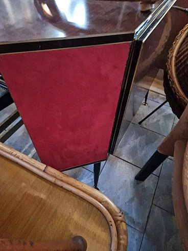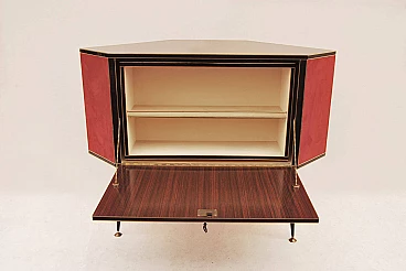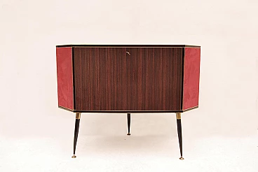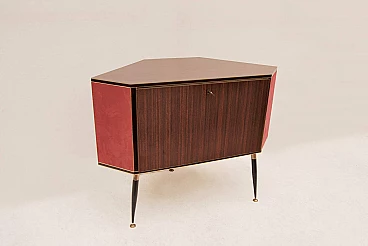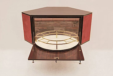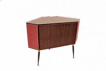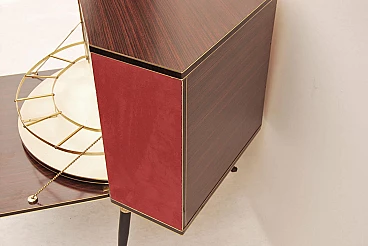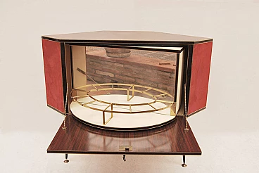 Questo mobile bar risale agli anni '50-'60 del XX secolo. E' stato costruito in legno e laminato effetto mogano con bordature nere e oro mentre i fianchi sono rivestiti in velluto rosso. Il contenitore interno, rivestito in laminato color avorio, è girevole e può alloggiare i bicchieri nella parte anteriore mentre nel retro, con specchio, può contenere bottiglie di vini o liquori.