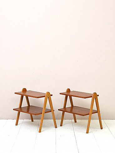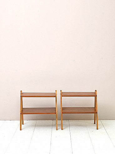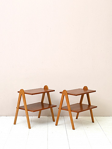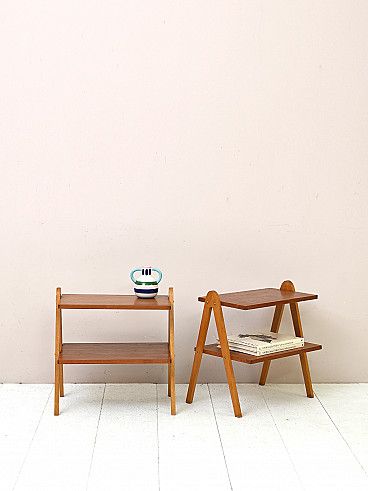 Coppia di tavolini in legno con doppio ripiano, anni '50. Possono essere usati anche come comodini. È stato effettuato un restauro conservativo con prodotti di origine naturale.