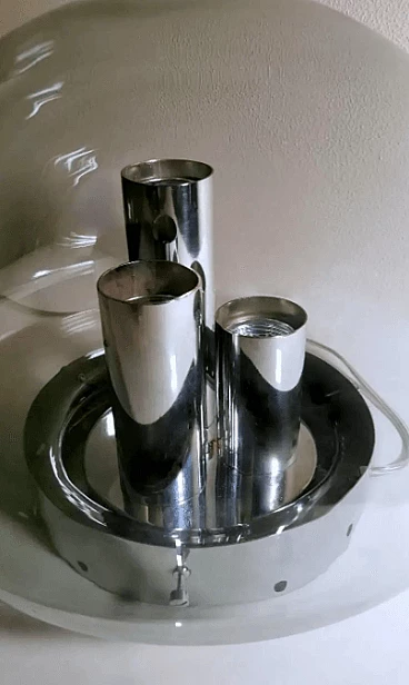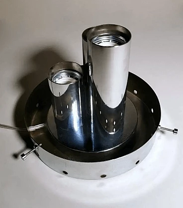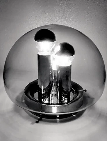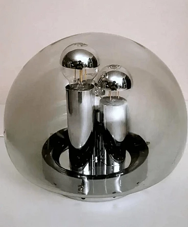 La lampada ha una base rotonda in metallo cromato all'interno della quale sono stati fissati tre tubi, anch'essi cromati, di diverse altezze che hanno la funzione di portalampada; alla lampada sono fissate le speciali e particolari lampadine che si adattano perfettamente allo stile dell'oggetto; l'intera struttura è ricoperta da una sfera di vetro fumé, sfera che può essere rimossa per la pulizia semplicemente allentando manualmente dei piccoli perni sulla base; nella parte inferiore della sfera è stata praticata un'apertura semicircolare per il passaggio dei fili elettrici, sul bordo della quale è presente una piccola scalfittura non visibile in quanto nascosta dalla base metallica. La lampada è priva di etichetta adesiva del produttore, ma in base allo stile, ai materiali e alla lavorazione, possiamo attribuirla con certezza alla ditta tedesca Doria-Werk, che la produsse tra il 1960 e il 1963. La lampada si sviluppa attorno ad elementi lineari e circolari che si integrano perfettamente, riesce ad essere ben contestualizzata in qualsiasi ambiente, dando quel tocco di originalità e particolarità che riscalda l'ambiente; il suo design anni '60 lascia spazio alla libertà e all'innovazione, è un pezzo unico. Misure diametro cm.32, altezza cm.27. La lampada è in buone condizioni. Piccola scalfittura nella sfera dove passano i fili elettrici. L'impianto elettrico è funzionante ma il cablaggio è europeo, la compatibilità del voltaggio in altri paesi deve essere sempre verificata da un elettricista prima dell'uso.