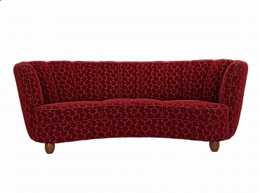 Divano danese a tre posti "Banana" risalente agli anni '60. Originale, in buone condizioni, senza odori. Tessuto originale rosso per mobili. Molle in ottone nella seduta. Gambe in legno di faggio. Il divano è stato controllato da un artigiano. Il divano non presenta difetti ma può presentare lievi tracce d'uso.