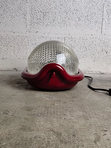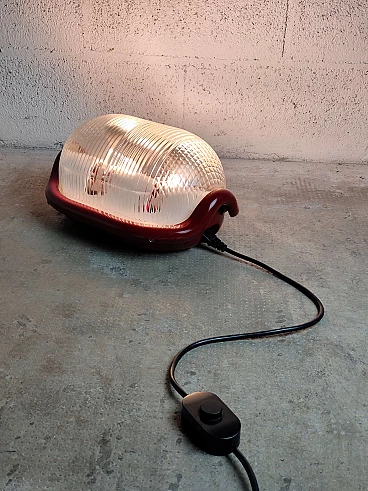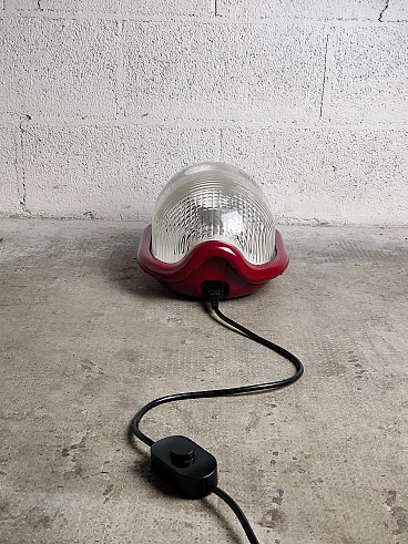 Lampada da terra Noce T disegnata da Achille Castiglioni e prodotta da Flos negli anni '70. Deve il suo nome alla forma arrotondata che suggerisce una mezza noce. La struttura è in alluminio pressofuso di forte spessore, il diffusore è in vetro pressato trasparente di forte spessore. Caratteristica è la sospensione degli zoccoli, che si trovano su un asse mobile che può essere regolato tramite una manopola esterna; l'angolo delle lampade riflettenti può essere regolato e la luce può essere allineata. Ottime condizioni.