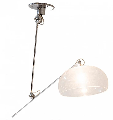 Lampadario attribuito a Claudio Salocchi per Sormani, anni '70. Struttura in acciaio cromato liberamente orientabile, paralume in vetro trasparente.