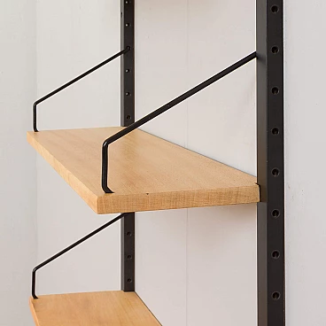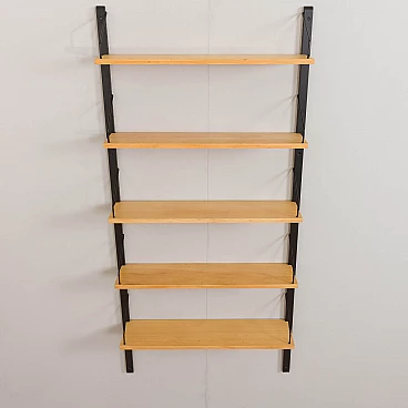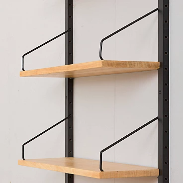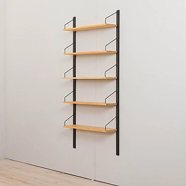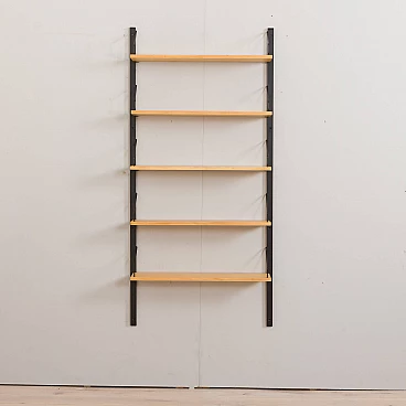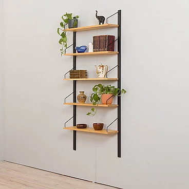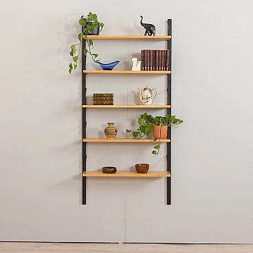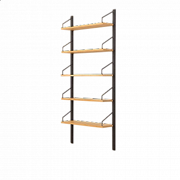 Libreria pensile bicolore in betulla nello stile di Poul Cadovius, realizzata in Danimarca negli anni '60. Le mensole sono del colore naturale del legno mentre gli elementi di sostegno sono verniciati di nero. Essendo un sistema modulare, le mensole possono essere disposte liberamente. Queste sono profonde 20 cm e sono state riverniciate con una lacca opaca.