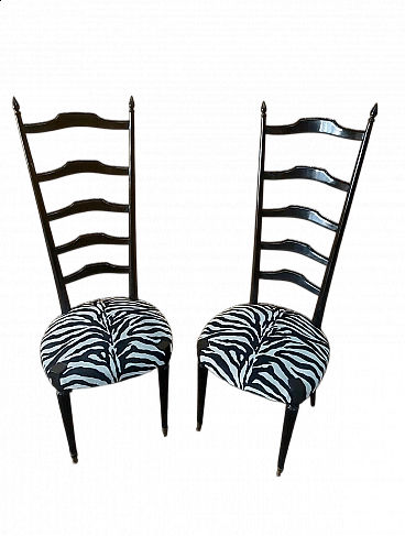 Coppia di sedie Art Déco chiavarine con schienale alto a scaletta, in legno di ebano, originali anni '50, con seduta in tessuto animalier zebrato bianco e nero. Condizioni perfette, leggerissime. Misure: altezza 125 cm, larghezza 40 cm, profondità 45 cm