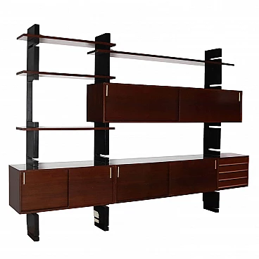 Libreria ad elementi a posizione intercambiabile con contenitori ad apertura scorrevole e cassetti a vista. Presenta montanti in legno laccato, legno impiallacciato jacaranda e alluminio ottonato.