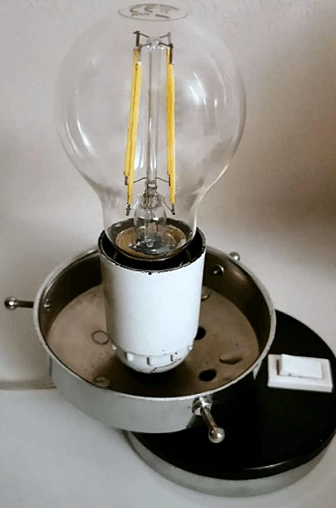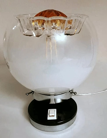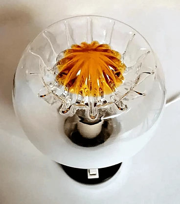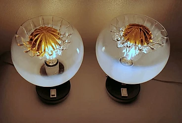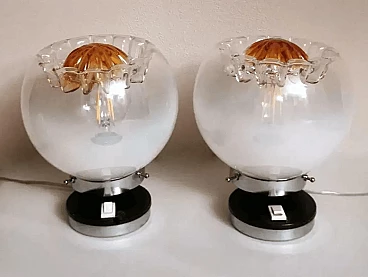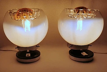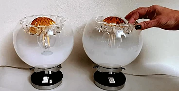 La struttura è costituita da una base rotonda in metallo nichelato ricoperta da un supporto in plastica su cui è alloggiato l'interruttore, sopra questa base, decentrata, è fissata una cornice rotonda, anch'essa in metallo nichelato, all'interno della quale si trova l'attacco per l'unica lampadina di grandi dimensioni ed è su questa cornice che è posta la sfera di vetro a copertura del punto luce, che può essere solidamente bloccata con tre viti poste sul bordo della cornice e sul fondo della stessa sono presenti quattro fori di aerazione per il raffreddamento. Lo sfalsamento delle due parti metalliche è molto originale e conferisce alla lampada un movimento esteticamente pregevole. Le sfere della coppia sono realizzate in vetro lattimo sfumato bianco soffiato a mano e, nella parte superiore, presentano un bellissimo e caratteristico motivo a incavo il cui centro è di colore arancione brillante. Quando sono illuminati, il vetro lattimo sfumato si esprime in tutta la sua particolare bellezza, e meravigliosi riflessi dorati emanano dalla lavorazione della parte superiore. Possiamo attribuirli con buona certezza alla ditta Mazzega di Murano, che ha spesso utilizzato questo tipo di combinazioni di colori materici nelle sue opere. Questi cristalli sono tanto più omogenei quanto maggiore è la concentrazione di ossido di zinco nella miscela. Questo tipo di vetro è molto utilizzato a Murano, nell'oggettistica ma soprattutto nell'illuminazione per la sua capacità di diffondere la luce in modo morbido e uniforme. Le lampade sono in buone condizioni. L'impianto elettrico è funzionante ma il cablaggio è europeo, la compatibilità del voltaggio in altri paesi deve essere sempre verificata da un elettricista prima dell'uso.