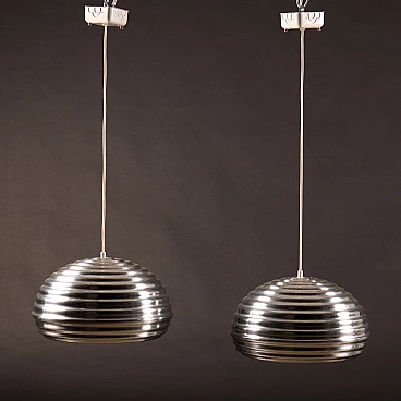 Coppia di lampade a sospensione Splugen Brau in alluminio cromato di Achille e Pier Giacomo Castiglioni per Flos, anni '70-'80.
