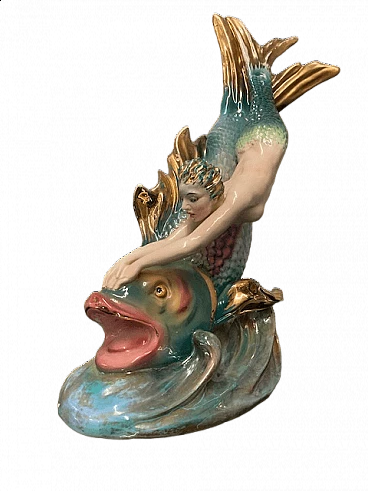 Scultura di sirena e pesce in maiolica di Bertolotti - Pannunzio, anni '40