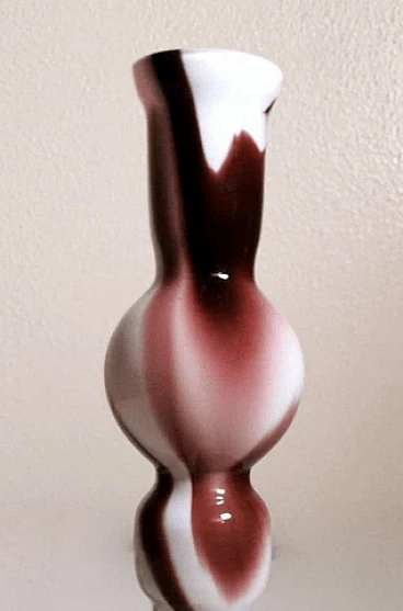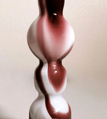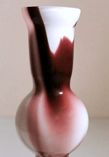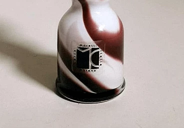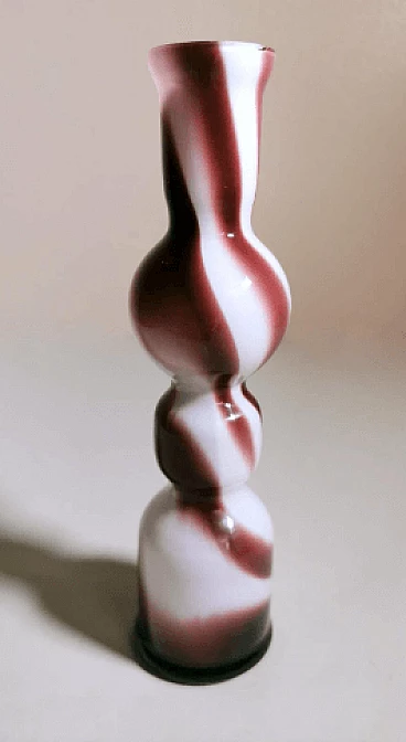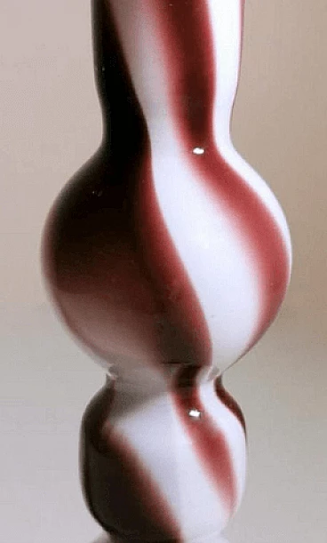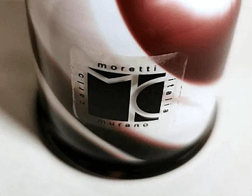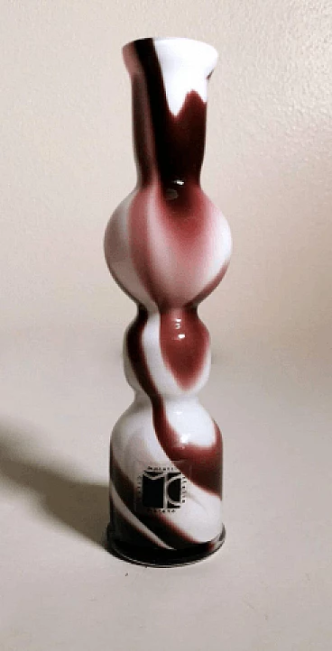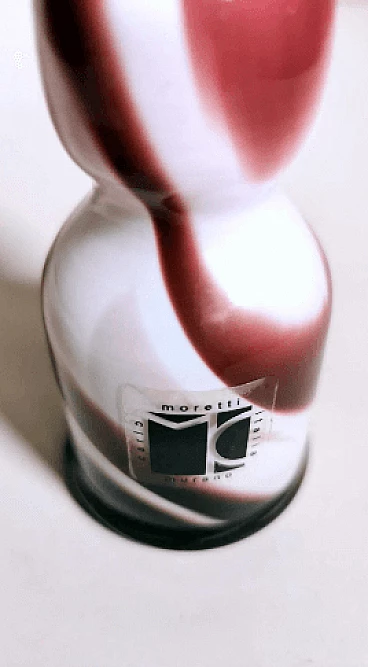 Piccolo e grazioso vaso dalla forma semplice e lineare in vetro opalino colorato realizzato tra il 1970 e il 1975. È stato soffiato in un unico pezzo senza giunzioni, poi modellato con maestria da abili artigiani presso la fornace artigianale di Murano di proprietà di Carlo Moretti. L'operazione più difficile e particolare è lasciare il bianco opalino all'interno e realizzare l'esterno con decori di altro colore: per farlo si aggiungono ossidi metallici per ottenere i diversi colori quando la bozza del vaso bianco opalino è già uscita dal forno; nel momento preciso in cui gli ossidi cominciano a sciogliersi e mescolarsi con il bianco, l'artigiano inizia la soffiatura e la modellazione del vaso, in modo veloce e rapido, così che il colore si distribuisca solo sulla superficie dell'oggetto senza penetrarla, come se fossero pennellate. Finito questo si rimette il vaso per brevissimo tempo in forno e poi si procede a un veloce raffreddamento; operazione che non tutti sono in grado di fare, infatti è delegata solo ai maestri vetrai. L'azienda è stata fondata da Carlo Moretti con il fratello Giovanni nel 1958 a Murano. Qui i due materializzano le infinite forme del vetro in raffinati oggetti di design; in anticipo sui tempi, innovano sempre e cominciano a contaminare il vetro con la forza del colore. Con il passare del tempo i due fratelli definiscono sempre più i loro ruoli in azienda: Carlo si occupa principalmente del design e della produzione, mentre Giovanni della comunicazione e delle strategie di mercato. Hanno saputo reinventare il design del vetro di Murano, prevedendo nel tempo i mutamenti del gusto e guidandoli attraverso le esigenze del mercato, rinnovando processi produttivi divenuti macchinosi e immaginando continuamente strategie di comunicazione volte all'intelligente internazionalizzazione della produzione isolana. Diceva Carlo Moretti: "Solo in apparenza il mondo del vetro trasmette un'idea di grande flessibilità perché non sta mai fermo, si muove e si espande, ma poi a conoscerlo bene presenta grandi limiti. Ecco perché uno entra in fabbrica con un'idea ma esce con un'altra. Ed è per questo che Moretti nasce come fabbrica d'arte, dove contano molto l'abilità del maestro e i processi produttivi. Il vetro è ribelle, non si doma, è un materiale in trasformazione continua, ha le sue regole, va assecondato in tutte le fasi del processo." Quelli che possono sembrare piccoli difetti interni o esterni al vetro (bolle, grumi, striature, ecc.) sono invece la prova del lavoro artigianale dietro l'oggetto.