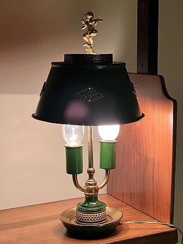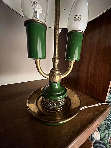 Lampada da tavolo in metallo smaltato verde e ottone, inizio '900