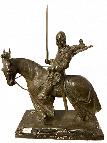 Antico cavaliere a cavallo in bronzo su base in marmo, scultura realizzata nei minimi dettagli. Spada in metallo incisa. Compaiono le iniziali dell'artista sul marmo. Perfetto stato, molto bella la patina. Misure : Altezza 41 cm, base 26 x 13 cm.