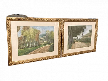 Antica coppia di dipinti dell' artista Pertice Menotti (1904–1966, Montopoli Val D’ Arno) raffiguranti alcuni sentieri di strade toscane, realizzate con la tecnica del pastello. Firmate in basso a destra 1937 Pertice Menotti. Ottimo stato conservazione, cornice dorata e vetro protettivo. Misure: 56 x 42 cm con cornice, 38 x 28 cm senza cornice. I due dipinti hanno solite dimensioni.