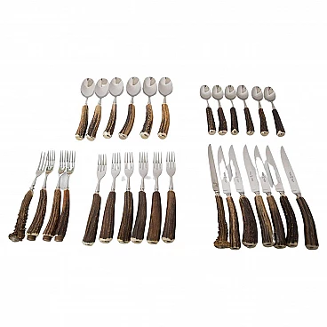 Magnifico ed eccentrico servizio di posate realizzato dal produttore tedesco Wingen Solingen negli anni '70. Il set appartiene alla famosa serie Othello, di cui si nota anche il marchio sui coltelli. Il set è stato poi messo in vendita dal prestigioso negozio milanese Mejana in Galleria Vittorio Emanuele a Milano. Il servizio infatti è nella sua scatola originale firmata Mejana Milano. Il servizio è così composto: 6 posate, 6 coltelli, 6 cucchiai, 6 cucchiaini, 4 forchette da dessert e 1 coltello sottile da formaggio. La bellezza e l'eccentricità del set derivano dai manici realizzati in modo eccentrico. Le posate sono tutte in acciaio e firmate dalla manifattura. In alcune posate troviamo un piccolo inserto in ottone nella punta del manico. Il set è ideale per completare i tavoli da pranzo di una baita o di una casa di montagna e per i collezionisti di posate più audaci.