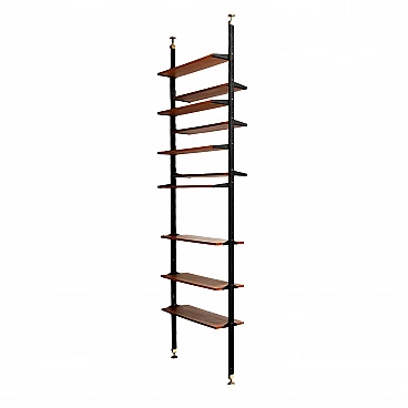 Libreria divisoria, anni '50-'60. Montanti in metallo smaltato, terminali regolabili in ottone, mensole in legno impiallacciato teak. I ripiani possono essere posizionati a piacere.