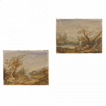 Coppia di dipinti italiani della metà del XX secolo. Tempere su tela di bella decorazione raffiguranti paesaggi in stile settecentesco. Quadri di buona misura e piacevole arredamento, mancanti di cornici. Presentano piccole cadute di colore e segni del tempo, nel complesso in discreto stato conservativo. Da restaurare.
