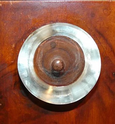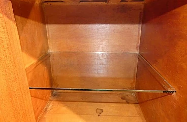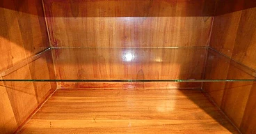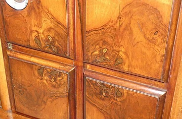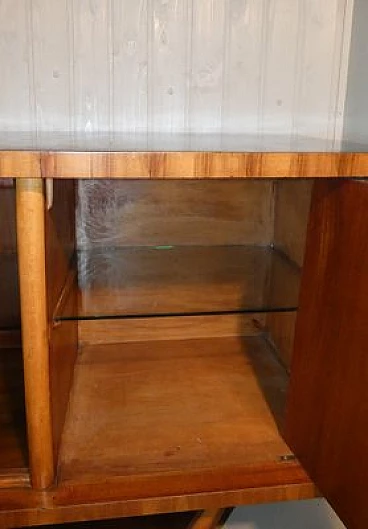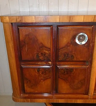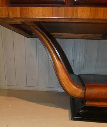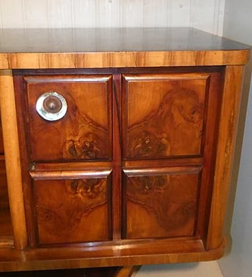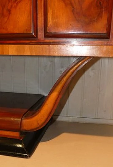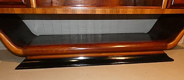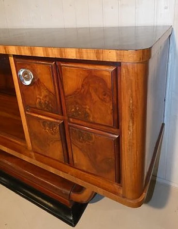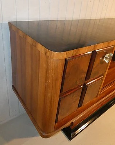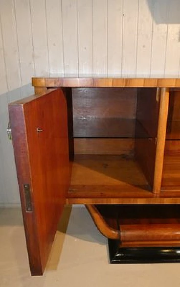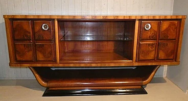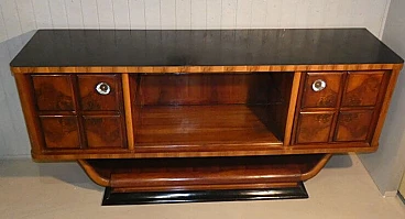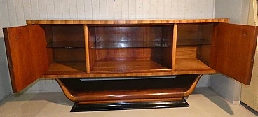 Credenza di pregio ed eccellente qualità. Prodotta in Francia nella metà degli anni '20, ha notevoli dimensioni, di grande pregio le finiture delle due ante a battente. La credenza, oltre alle ante laterali dotate di ripiani in vetro interni, nella porzione centrale presenta un vano a giorno anch'esso provvisto di mensola in vetro. La base ebanizzata con motivo sinuoso è tipica dello stile Decò, nera, come il piano superiore del mobile. Perfetti i pomoli in vetro liscio che nell'insieme conferiscono leggerezza. La credenza è inoltre dotata di due vetri scorrevoli originali che possono essere inseriti a chiusura, nelle apposite guide del vano a giorno. Pubblicata a pag. 212 del libro "Passato Prossimo, tra antiquariato e modernariato" a cura di Elisabetta Barbolini Ferrari ed Augusto Bulgarelli ed edito da l Poligrafico artioli Spa nel novembre dell'anno 2000. Dimensioni: H. 94,5 cm, L. 193 cm, P. 50 cm.