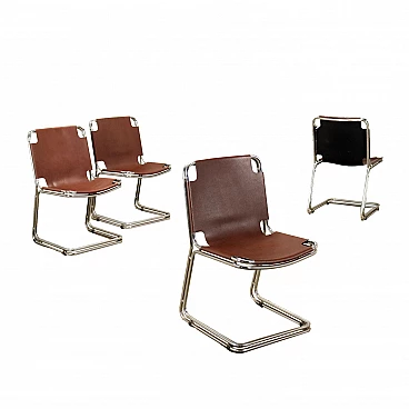4 Sedie in metallo cromato e cuoio, anni '70