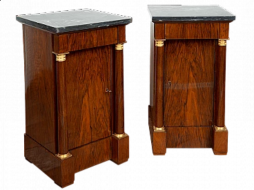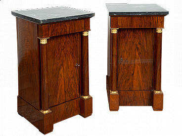 Coppia di comodini Impero in radica di noce con piano in marmo grigio bardiglio, '800