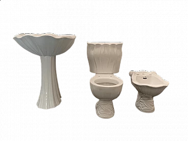 Lavabo, water e bidet in ceramica appartenenti alla serie Conchiglia disegnata da Antonia Campi per Lavenite (poi proposta da Richard Ginori e Pozzi Ginori), anni '60. Il lavabo è alto 90 cm, largo 74 cm e profondo 52 cm. Il water è alto 78 cm, largo 45,5 cm e profondo 70,5 cm. Il bidet è alto 38 cm, largo 40 cm e profondo 62,5 cm.