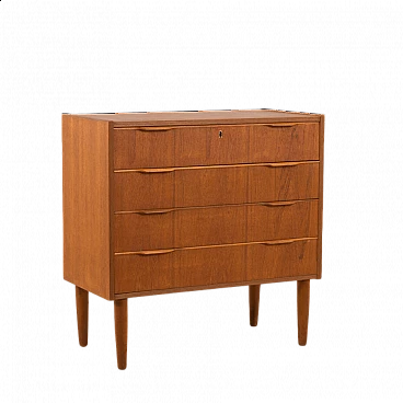 Comò danese vintage minimalista in teak con quattro cassetti, progettato e realizzato negli anni '60. Le maniglie e le gambe sono in teak massiccio e i cassetti sono spaziosi e funzionano senza problemi. Le gambe affusolate conferiscono leggerezza, tipica del design scandinavo di metà secolo, e sono smontabili per un trasporto più comodo. Il pezzo valorizzerà qualsiasi ingresso o camera da letto con un look di metà secolo e uno spazio di archiviazione funzionale. Il cassetto superiore è dotato di serratura, ma la chiave non è inclusa. Nel complesso, fantastico stato d'epoca, con lievi tracce d'uso legate all'età. Altezza cassetti: 11 cm, altezza da terra: 23 cm. Inviateci il vostro codice postale per conoscere i tempi e i costi di spedizione per la vostra precisa località. Possiamo spedire in qualsiasi paese del mondo, ma i tempi di elaborazione dell'ordine variano da paese a paese. Siamo felici di negoziare il prezzo, soprattutto se avete deciso di acquistare più pezzi.