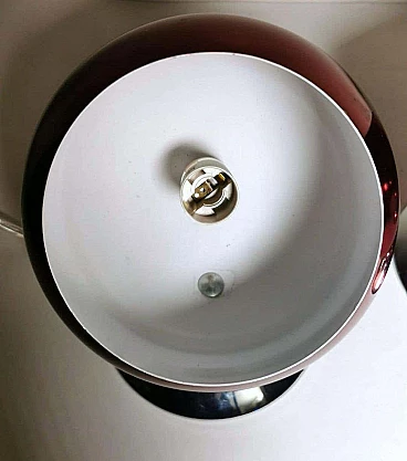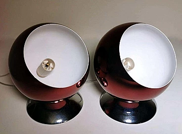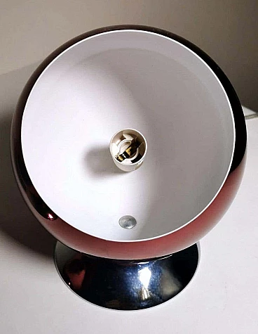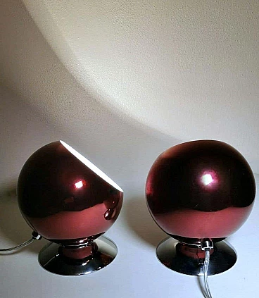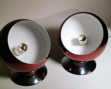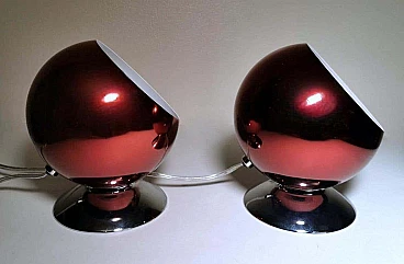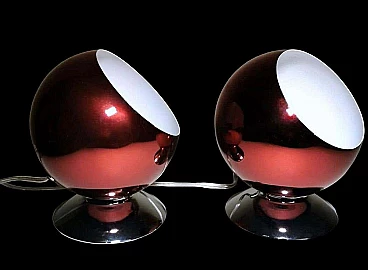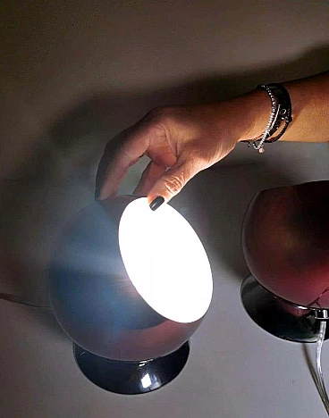 Iconica coppia di abat-jour dal design a bulbo oculare in stile Space Age. Sono realizzate in alluminio, quindi leggere e maneggevoli; hanno poi subito un trattamento del tutto particolare, infatti è stata utilizzata una vernice a fuoco rossa molto trasparente che depositandosi sull'alluminio bianco ha conferito alle due lampade uno straordinario e insolito effetto lucido (dobbiamo confessare che questo effetto ci ha creato non pochi problemi per le fotografie). La forma della scocca, internamente bianca, direziona la luce in modo ottimale e discreto per non disturbare l'utente che le usa come abat-jour sul comodino e le accende dal letto. Non hanno marchi o etichette, ma possiamo attribuirli con certezza all'azienda olandese Gebroeders Posthuma di Amsterdam, che li ha realizzati tra il 1970 e il 1975. Gebroeders Posthuma era un'azienda familiare fondata nel 1965 ad Amsterdam dai fratelli Posthuma, il cui nome "Gepo" deriva dalla combinazione di Gebroeders Posthuma. I due fratelli fondarono la loro azienda con un capitale molto basso, che oggi corrisponderebbe a 35 euro (preso in prestito dalla madre). Nel 1972 l'azienda raggiunse un fatturato di ben 1 milione di euro! L'obiettivo era quello di produrre oggetti di illuminazione di ottima qualità, ma a prezzi democratici, si specializzarono nella progettazione di lampade da terra, da parete, da tavolo e ad arco, ma tutte con il tipico design Space Age. Di Gepo si sa poco, ma una cosa è certa: i loro prodotti noti sono uno per uno pezzi di design bellissimi, eleganti e senza tempo. Gepo terminò la sua attività all'inizio degli anni '80. Lo stile Space Age inizia un viaggio nel passato che si rivolge al futuro e fantastica su immagini tecnologiche nello spazio; la forma sferica predomina per la maggior parte delle decorazioni e dell'illuminazione, spesso se diverse sfere sono collegate tra loro, richiamano esplicitamente la forma dell'atomo. Nello stile Space Age è molto comune anche l'uso di materiali riflettenti, soprattutto per le lampade, per richiamare i colori tipici delle tecnologie spaziali: acciaio, nichel, alluminio e argento. Le nostre abat-jour si sviluppano attorno a elementi circolari morbidi ed essenziali che si adattano perfettamente, riescono a essere ben contestualizzate in ogni stanza, dando quel tocco di originalità e particolarità che riscalda l'ambiente. Il loro design anni '70 lascia spazio alla libertà e all'innovazione, sono pezzi unici da esporre con cura e da raccontare, non sono semplici lampade, sono molto di più. Misure diametro 18 cm, altezza 20 cm. Gli articoli sono in buone condizioni L'impianto elettrico è funzionante ma il cablaggio è europeo, la compatibilità del voltaggio in altri paesi deve essere sempre verificata da un elettricista prima dell'utilizzo. Per tutte le nostre spedizioni utilizziamo materiali di imballaggio speciali (casse di legno, polistirolo, ecc.) per la massima protezione e sicurezza degli oggetti.