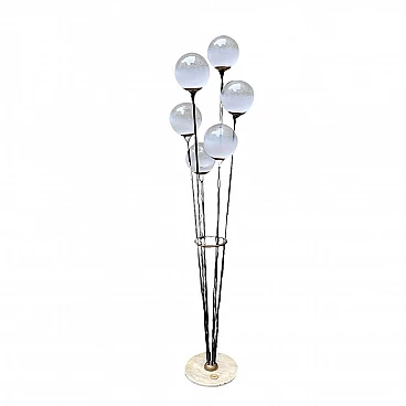 Stilnovo viene fondata a Milano da Bruno Gatta nel 1946. Nel dicembre 1946 Stilnovo fa la sua prima apparizione su Domus, dove vengono pubblicate due lampade da tavolo e un vassoio in ottone. Nel 1949 entra in azienda il fratello di Bruno Gatta, Paolo. Stilnovo raggiunge l'apice del successo a cavallo tra gli anni '50 e '60. In questo periodo collabora con architetti e designer di alto profilo per diversi progetti, tra cui Achille e Pier Giacomo Castiglioni, Melchiorre Bega, Gae Aulenti, Joe Colombo ed Ettore Sottsass. Questa lampada da terra è uno dei prodotti più iconici di Stilnovo, il cui nome è "Alberello" perché la sua forma ricorda una specie di albero, in cui i rami sono qui diffusori colorati in vetro. La lampada ha una base rotonda in marmo e il "tronco" è costituito da sei colonne in metallo e ottone. In buone condizioni, perfettamente funzionante, completamente originale.