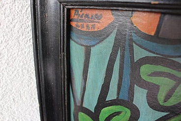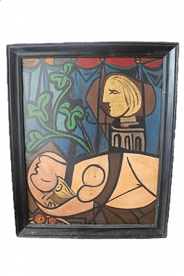 Composizione cubista con figure erotiche nello stile di Picasso, olio su tavola, anni '70